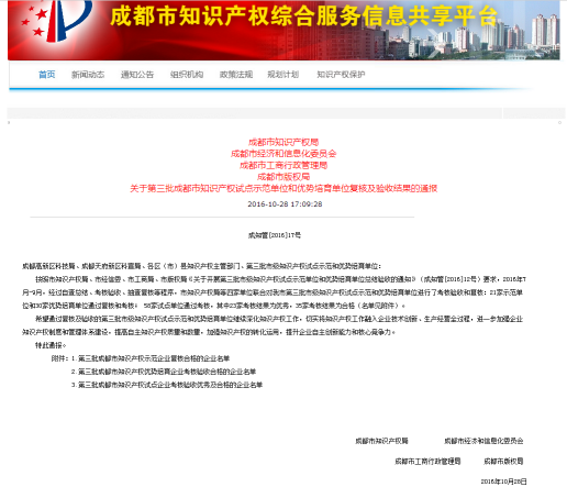 成都普思生物科技股份有限公司自2014年成為成都市知識(shí)產(chǎn)權(quán)試點(diǎn)企業(yè)以來,公司不斷進(jìn)取、日益壯大,努力實(shí)現(xiàn)產(chǎn)、學(xué)、研結(jié)合,提高了自主知識(shí)產(chǎn)權(quán)的數(shù)量和質(zhì)量,加快了知識(shí)產(chǎn)權(quán)的運(yùn)用轉(zhuǎn)化,在知識(shí)產(chǎn)權(quán)工作制度的完善、知識(shí)產(chǎn)權(quán)工作人才隊(duì)伍的壯大、專利的申請(qǐng)、轉(zhuǎn)化實(shí)施和相關(guān)產(chǎn)品銷售等方面都取得了豐碩的成果。在2016年10月成都市知識(shí)產(chǎn)權(quán)局組織的復(fù)核及驗(yàn)收工作中,成功通過驗(yàn)收,驗(yàn)收考核結(jié)果為“優(yōu)秀”。
