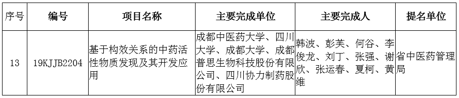 由四川省中醫(yī)藥局提名,我司作為主要完成單位之一申報(bào)的“基于構(gòu)效關(guān)系的中藥活性物質(zhì)發(fā)現(xiàn)及其開(kāi)發(fā)應(yīng)用”項(xiàng)目獲四川省科學(xué)技術(shù)進(jìn)步獎(jiǎng)(科技進(jìn)步類)一等獎(jiǎng),公司董事長(zhǎng)兼總經(jīng)理劉丁先生、原副總經(jīng)理夏柯先生是項(xiàng)目的主要完成人。項(xiàng)目的主要完成單位還有成都中醫(yī)藥大學(xué)、四川大學(xué)、成都大學(xué)和四川協(xié)力制藥股份有限公司。