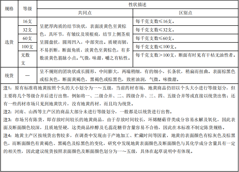 根據(jù)市場流通情況,對(duì)藥材是否進(jìn)行等級(jí)劃分,將地黃分為“選貨”和“統(tǒng)貨”兩個(gè)規(guī)格。