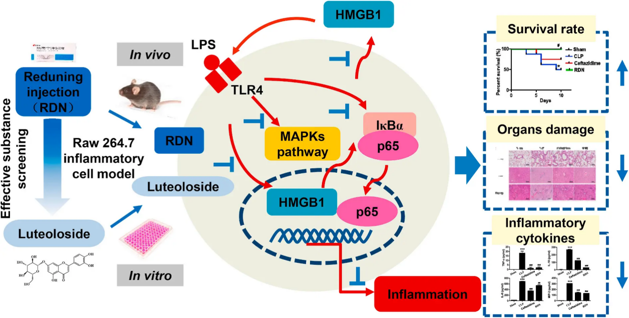 3.膿毒癥:木犀草苷通過(guò)抑制HMGB1的核質(zhì)轉(zhuǎn)移及分泌,阻斷下游TLR4/MyD88依賴的NF-κB和MAPKs信號(hào)通路激活,從而緩解過(guò)度炎癥反應(yīng)。該作用機(jī)制為膿毒癥治療提供了新靶點(diǎn)。[4]