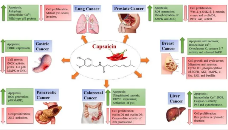 4.抗癌作用:多項研究表明,辣椒素可以調(diào)節(jié)參與癌細(xì)胞增殖、細(xì)胞周期阻滯、信號轉(zhuǎn)導(dǎo)、凋亡和轉(zhuǎn)移的基因和酶的表達(dá)水平,具有顯著的抗腫瘤活性,對胃癌、乳腺癌、肺癌、前列腺癌、結(jié)直腸癌、胰腺癌等多種類型的人類癌癥均有較強(qiáng)的抗癌作用(圖一)。