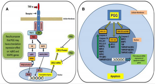 圖一 PGG在MM-231和MM-468三陰性乳腺癌細(xì)胞中的抗癌和促凋亡機(jī)制。(A) PGG抑制TNF-α刺激的CXCL1 mRNA和蛋白表達(dá),通過調(diào)節(jié)NFκB和MAPK信號通路中涉及的基因作為可能的分子機(jī)制。(B) PGG誘導(dǎo)與凋亡相關(guān)的特定基因在MM-231和MM-468三陰性乳腺癌細(xì)胞系中的表達(dá)。