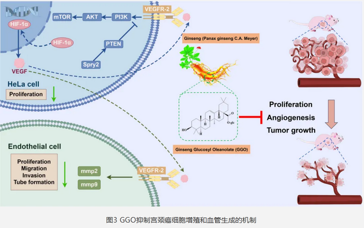 研究者通過酶轉(zhuǎn)化將人參皂苷Ro轉(zhuǎn)化為人參葡萄糖基齊墩果酸(GGO),通過抑制PI3K/AKT/HIF-1α信號通路,減少HIF-1α的核轉(zhuǎn)位和VEGF的表達,從而抑制宮頸癌細(xì)胞的增殖和血管生成。[10]