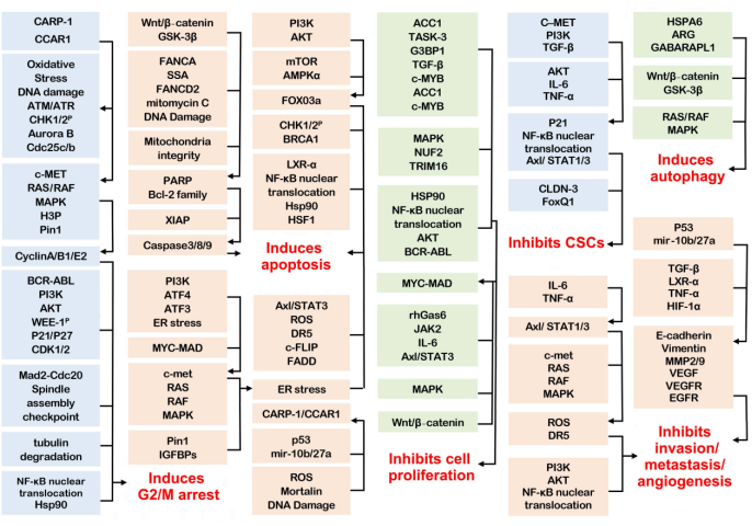 1.誘導細胞周期阻滯與凋亡:通過上調(diào)促凋亡蛋白(Bax、p53)和抑制抗凋亡蛋白(Bcl-2、Bcl-xL),激活線粒體途徑和Caspase級聯(lián)反應,導致癌細胞死亡;同時通過抑制CDK/cyclin復合物,阻滯細胞周期于G2/M期。[1]