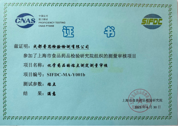 近日,成都普思生物科技股份有限公司旗下子公司“成都普思檢驗檢測有限公司”通過了由上海市食品藥品檢驗研究院于2025年組織的測量審核項目“化學(xué)藥品的熔點測定”,結(jié)果為“滿意”。