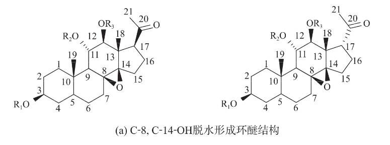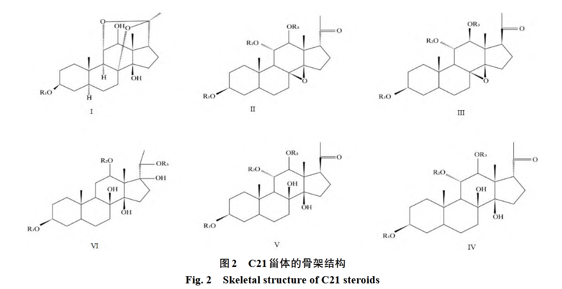 C21甾體皂苷是一類由含有21個碳原子的孕甾烷衍生物與糖鏈相連形成的苷類分子,其具體骨架類型為6種不同結(jié)構(gòu)的苷元(圖2 I~VI)。C-8、C-14-OH脫水形成環(huán)醚是通關(guān)藤所特有的母環(huán)結(jié)構(gòu)(II型)。